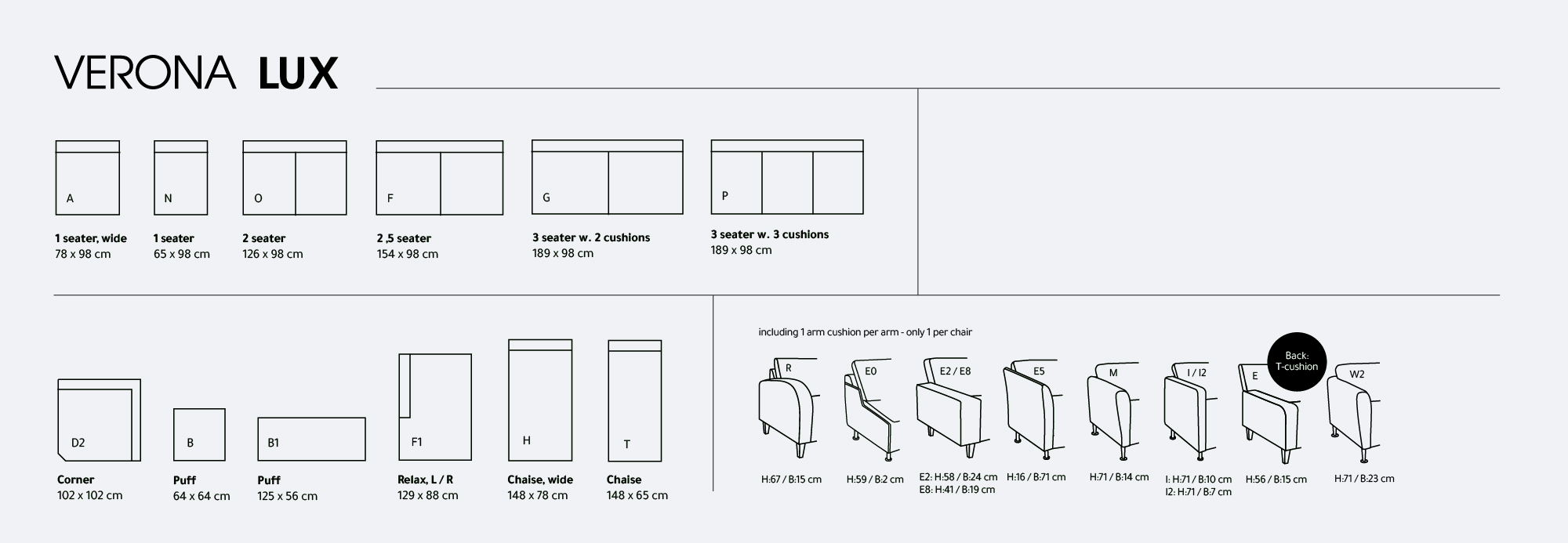 Verona Lux tilbyder forskellige løsninger i forhold til, hvor mange personer der skal kunne sidde i sofaen - man kan nemlig selv bestemme, hvilke moduler den skal opbygges af. Sofaen kan designes, så der kun er plads til to, men man kan også vælge at designe en stor model med plads til mange personer, og hvor man rigtigt kan slænge sig. Her på siden kan du se, hvor mange moduler der tilbydes til opbygningen. Vælg mellem få sæder, mange sæder eller en chaiselong. Alt er muligt.